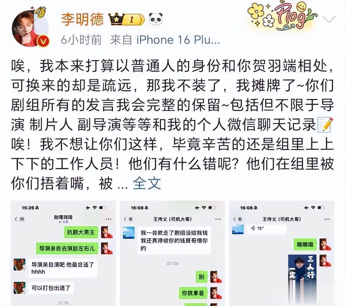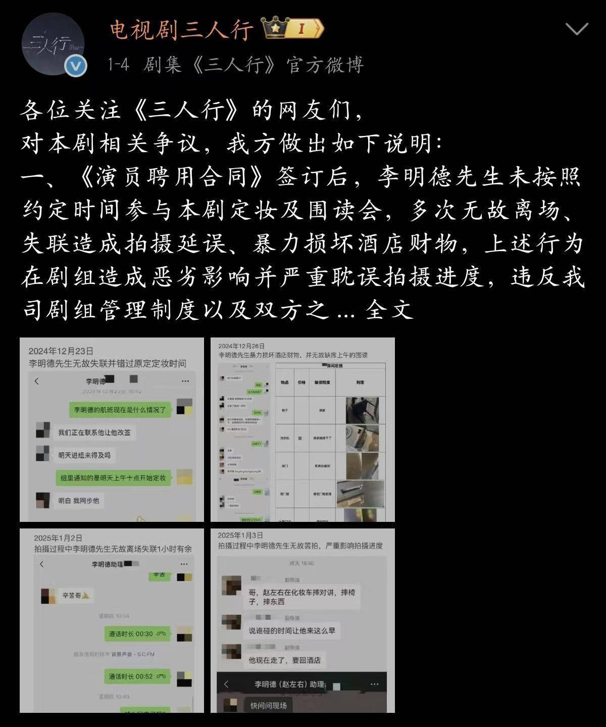 当时演员李明德在社交平台上发文控诉《三人行》剧组搞区别对待,